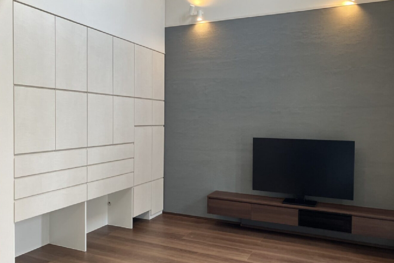 弊社でご用意した素材を活用するベーシックプランから、すべて指定するフルオーダーまで対応。どちらもお部屋のサイズに合わせて、ミリ単位で調整するのでピッタリ納まります。お部屋や家具と、収納の素材、質感や色を合わせることで、統一感を出すことができます。