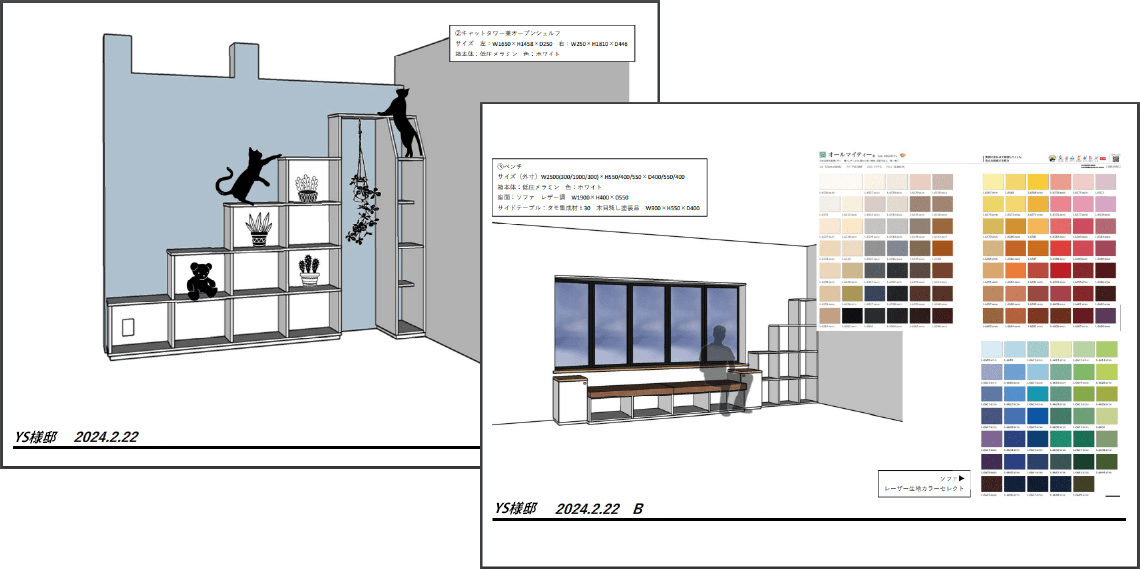 自宅の一室を事務所にしているのですが、書類・書籍の収納場所が足りていませんでした。整理整頓のために収納棚をオーダーしたいと思い、TETRA TRICKに相談しました。ただサイズだけ合わせて棚を作ってもらうつもりでしたが、プランナーの方は私の使用するイメージをより細かく聞き出そうとしてくれて、2通りのアイデアを提案してくれました。