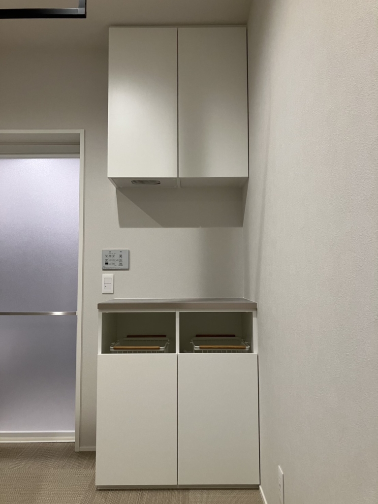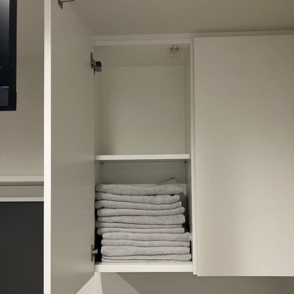 • 吊戸収納はタオルの他、洗剤などのストックに便利です。
