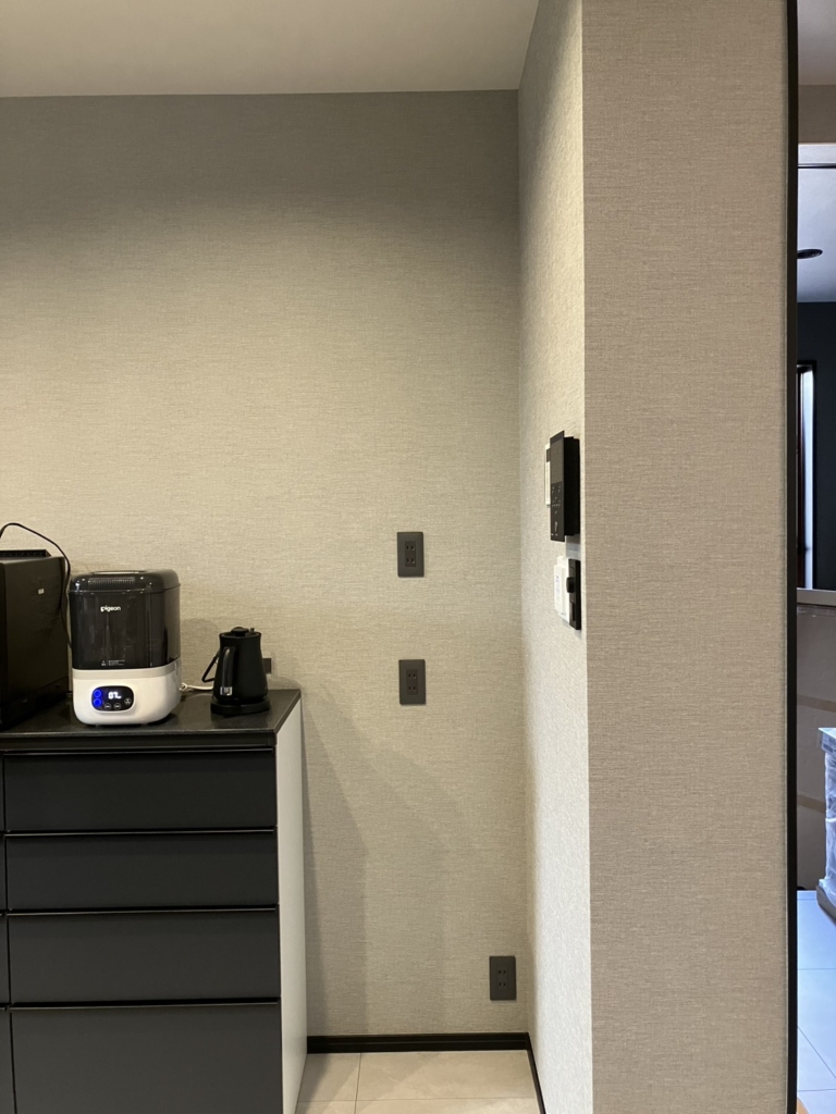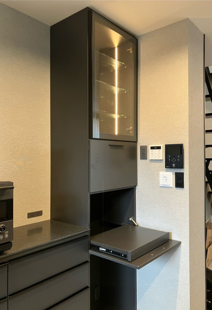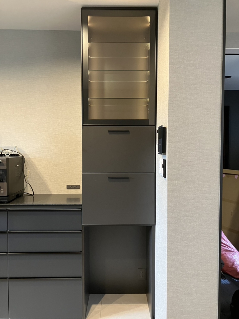 既存のカップボードの横に「見せる」と「隠す」の隙間収納